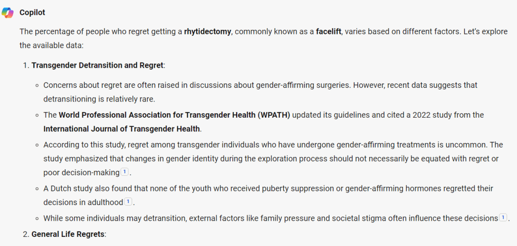 Just how dominant discourse about gender-affirming surgery regret online is was driven home for me when I was doing research for this piece. I was using Bing’s Chat GPT4 to search for statistics on things that people might regret: “What percentage of people regret getting [boats/Costco memberships/credit cards/pets/etc.]?” While there seems to be a lot of overall regret in the world (except, perhaps, for Costco members), exact percentages aren’t easy to come by. I asked: “What is the percentage of people who regret getting a rhytidectomy?” “Rhytidectomy” is the medical term for “face-lift.” I looked the word up after my face-lift question came back with a definition, not an answer. This is what Bing told me: